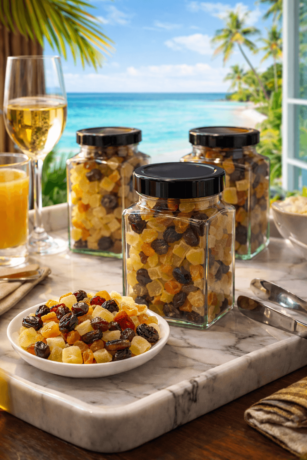 Aranymazsola, kandírozott ananász kocka, kandírozott gyömbér kocka, kandírozott papaya kocka, kandírozott vörösáfonya, naprafogó olaj, cukor, antioxidáns: kén-dioxid